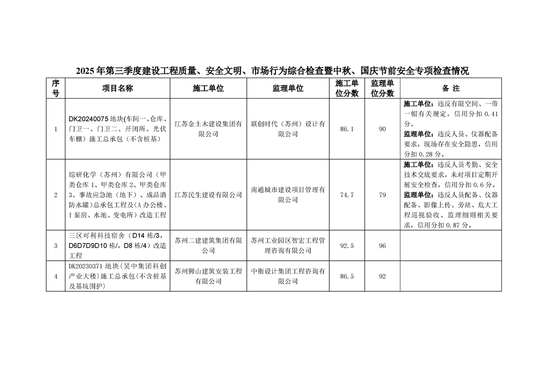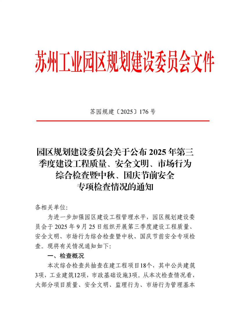 園區(qū)規(guī)劃建設(shè)委員會(huì)關(guān)于公布2025年三季度建設(shè)工程質(zhì)量、安全文明、市場(chǎng)行為綜合檢查暨中秋、國(guó)慶節(jié)前安全專項(xiàng)檢查情況的通知