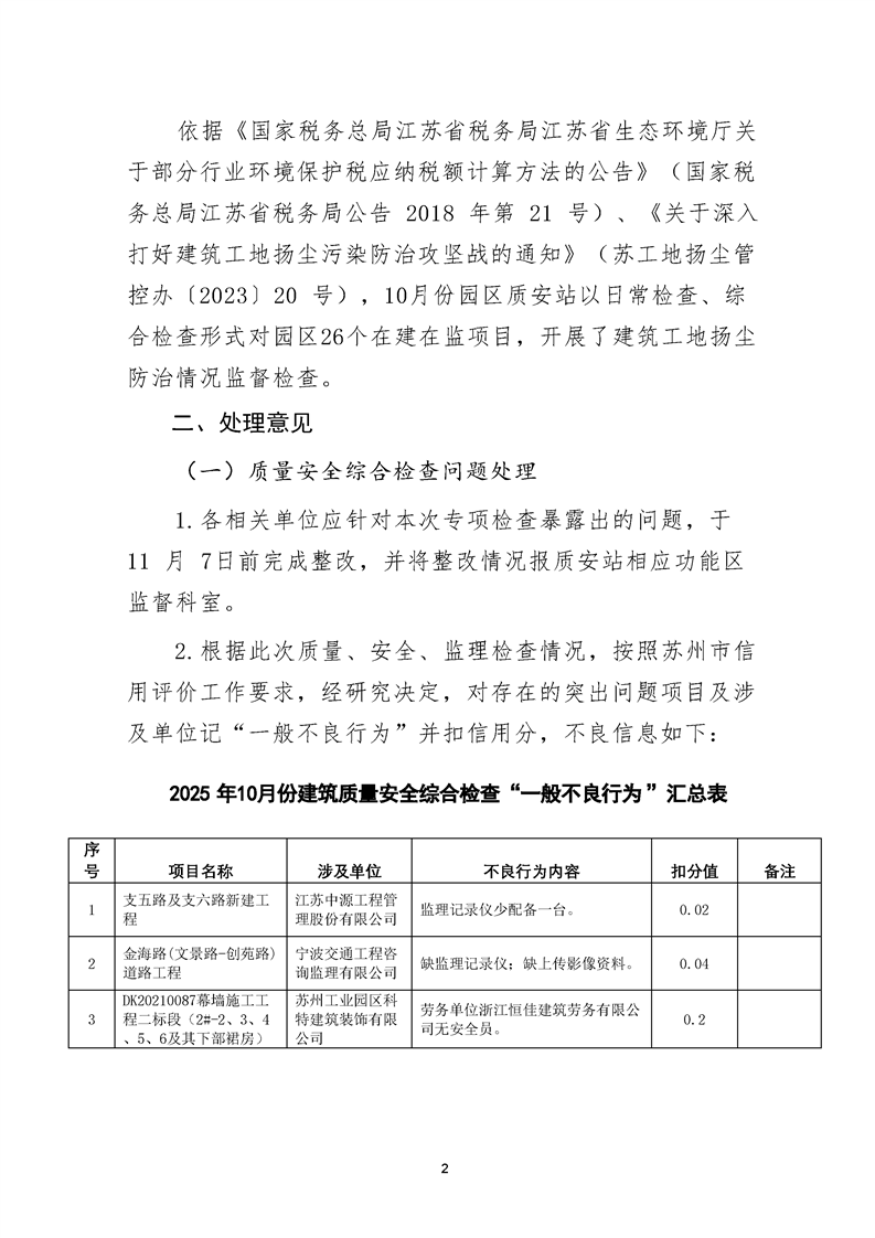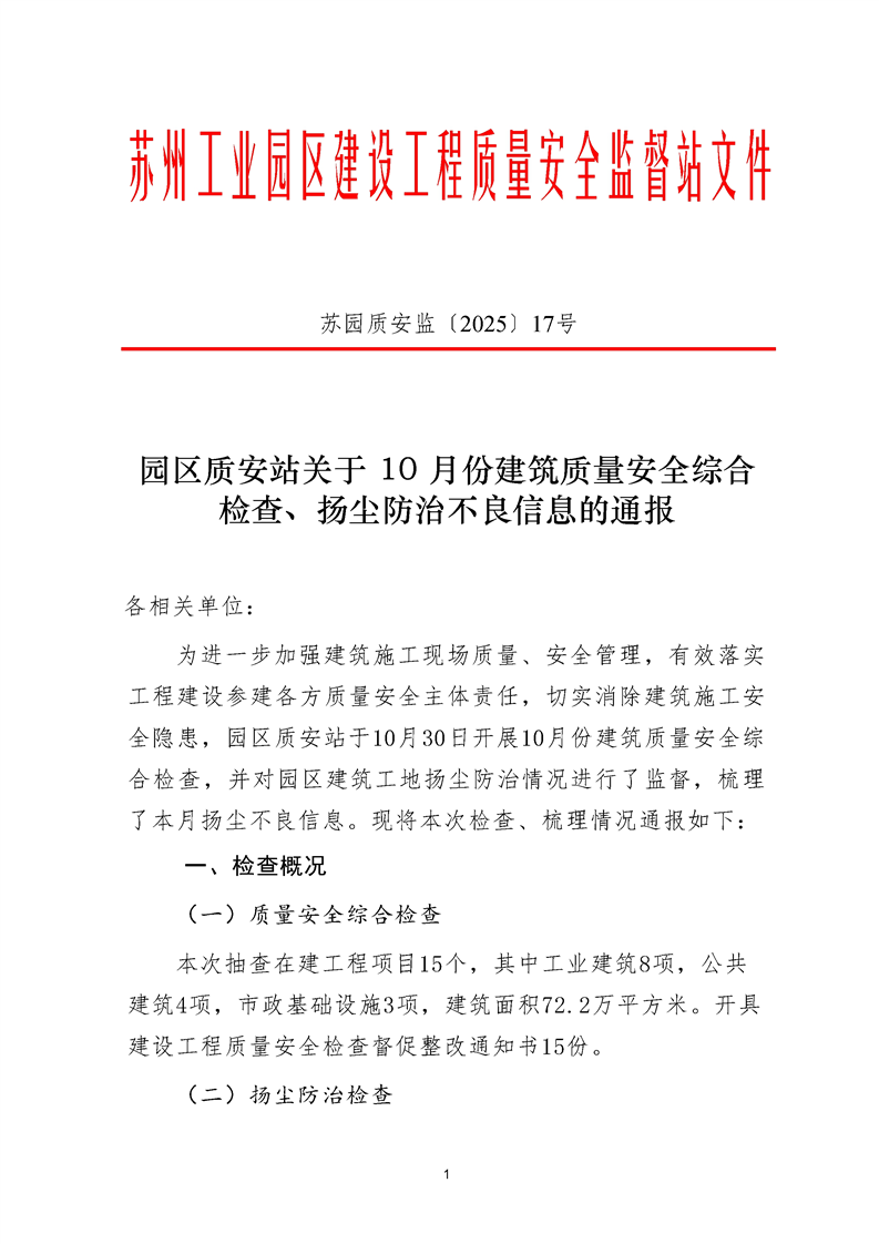 園區質安站關于10月份建筑質量安全綜合檢查、揚塵防治不良信息的通報