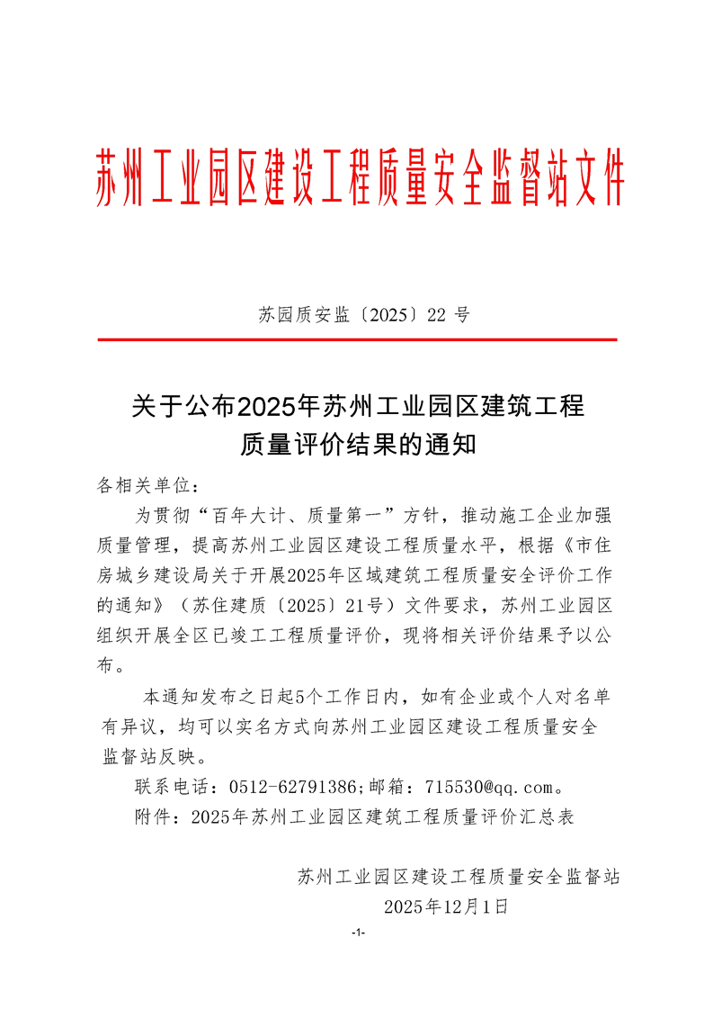 關于公布2025年蘇州工業園區建筑工程質量評價結果的通知