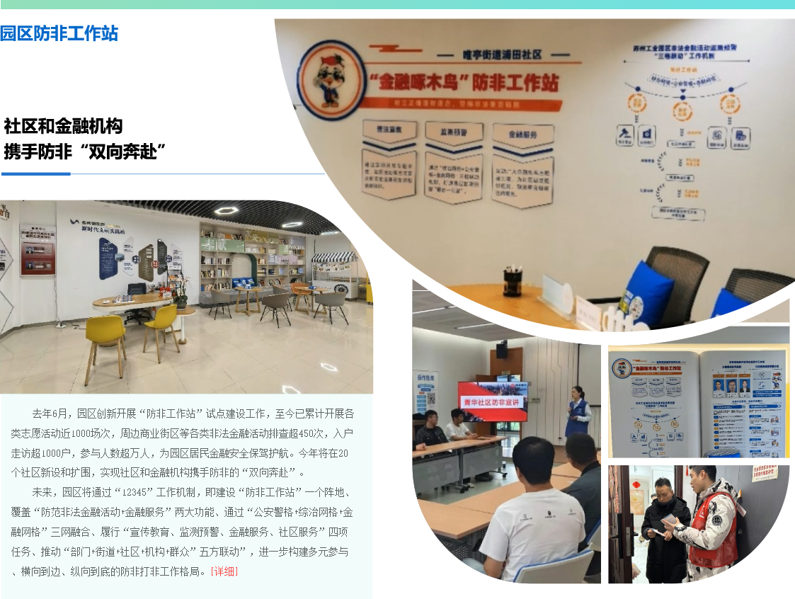 今年6月是第13個全國防范非法集資宣傳月,6月16日,蘇州工業園區舉行2025年防范非法金融活動集中宣傳日活動?,F場,園區金融風險防控系統正式上線,20個防非工作站新設和擴圍,進一步深化金融普法教育,推動“防非”宣傳教育工作落地生根、開花結果。防范非法金融活動宣傳教育工作是維護金融秩序穩定、保障金融穩健運行的重要基石。作為區域金融高地,園區堅持線上線下統籌推進,筑牢防范非法集資的社會防線。線上,動態監測全域企業,提高風險識別科學性和準確性,逐漸形成“底數清、責任明、發現早、處置快”一網縱觀全局的智能神經中樞;線下,深化“防非工作站”內涵,用好金融“鄰”距離系列活動資源,同時積極發動1.7萬... [詳細]