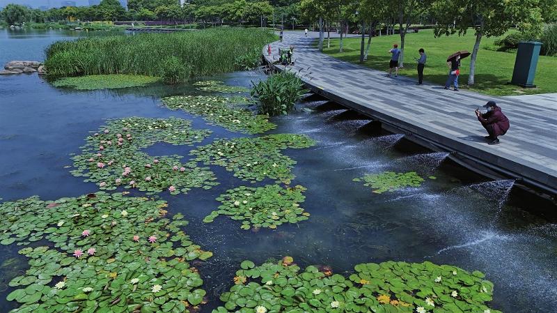 昨天,環(huán)金雞湖步道新安裝的凈水系統(tǒng)啟用,一排噴頭不斷向湖面噴射清水,使湖水快速流動(dòng),有效防止藍(lán)藻滋生。清澈的湖面上睡蓮盛放,引來行人駐足觀賞。