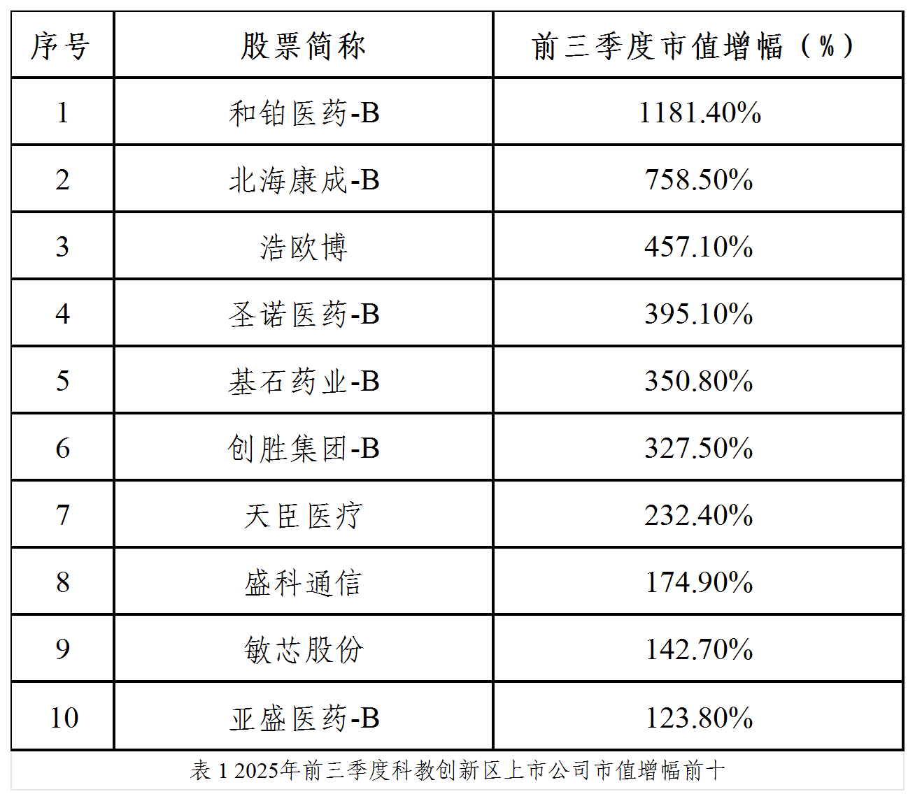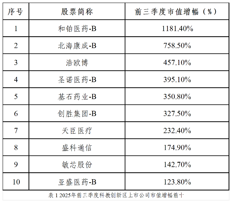 根據(jù)Wind數(shù)據(jù),截至2025年三季度末,科教創(chuàng)新區(qū)46家上市公司總市值約5982億元,同比增長(zhǎng)82.4%,充分展現(xiàn)出區(qū)域資本集聚效應(yīng)。近九成企業(yè)市值實(shí)現(xiàn)同比增長(zhǎng),超半數(shù)企業(yè)增速超過50%,13家企業(yè)市值翻倍,市場(chǎng)信心充沛。其中,創(chuàng)新藥板塊強(qiáng)勢(shì)反彈,估值大幅修復(fù),迎來“小陽(yáng)春”。