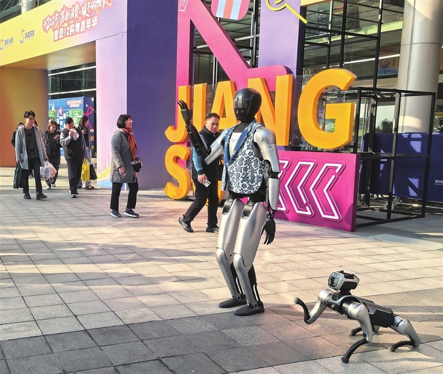 昨日,蘇州國際博覽中心廣場,機器人與機器狗舉手相迎,熱情招呼市民進館參觀。