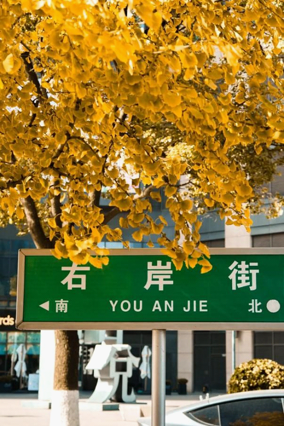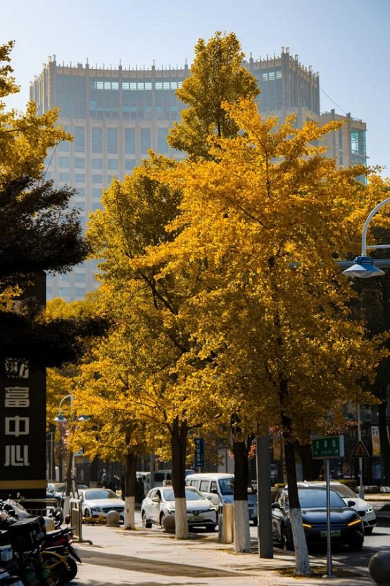 Near Suzhou Eslite Bookstore, a ginkgo-lined promenade composes warm verses for city dwellers. Golden leaves form a radiant screen, while fallen foliage and sleek architectural lines create a visually striking, geometric composition.