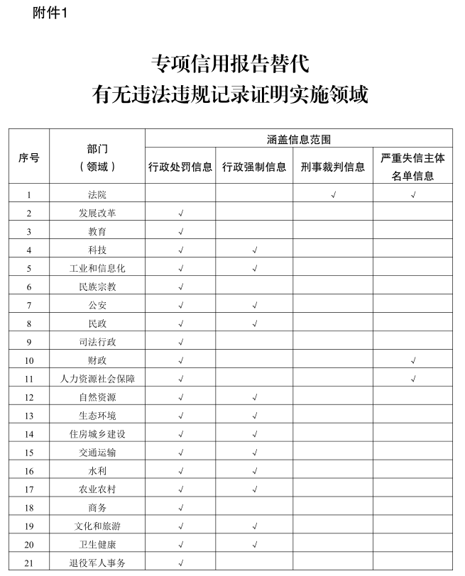 附件:1.專項(xiàng)信用報(bào)告替代有無(wú)違法違規(guī)記錄證明實(shí)施領(lǐng)域